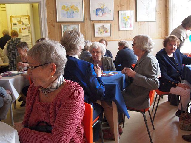 Jäsentilaisuudessa ti 27.5. juhlitiinn Ritvan päivää! Ritva Tammivaara kertoi omasta kuvataideharruksestaan kuvien kera ja Hilkka Säilynoja taiteen merkityksestä ihmiselle. Kuvassa keinutuolin takana Ritvat Nurmi ja Tammivaara ja keinutuolissa Hilkka Säilynoja.