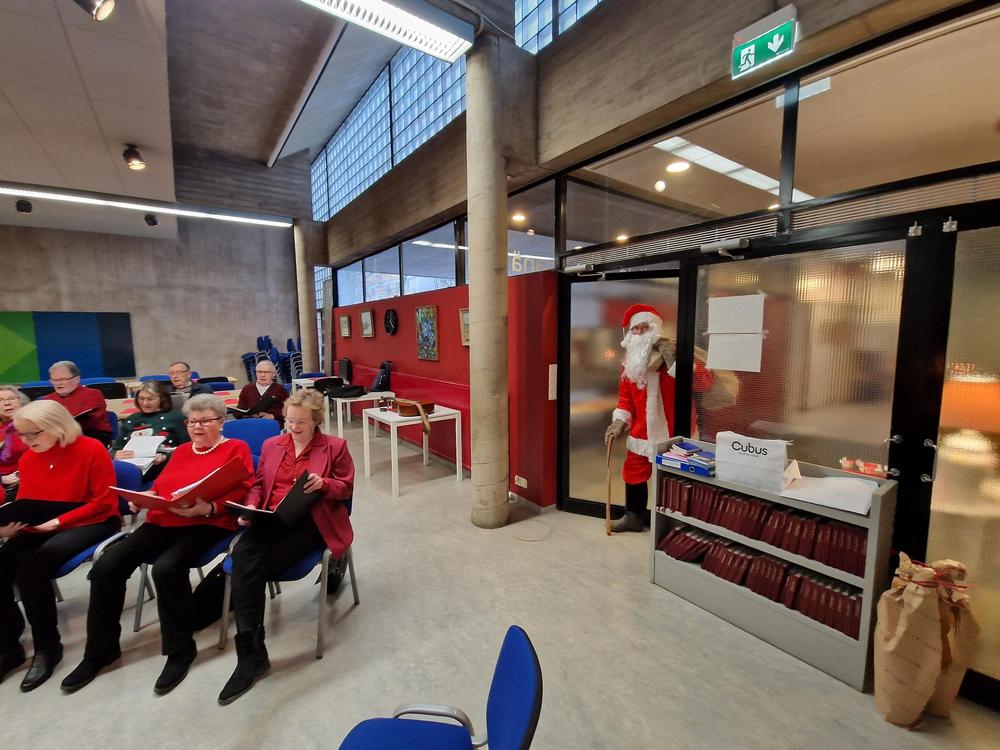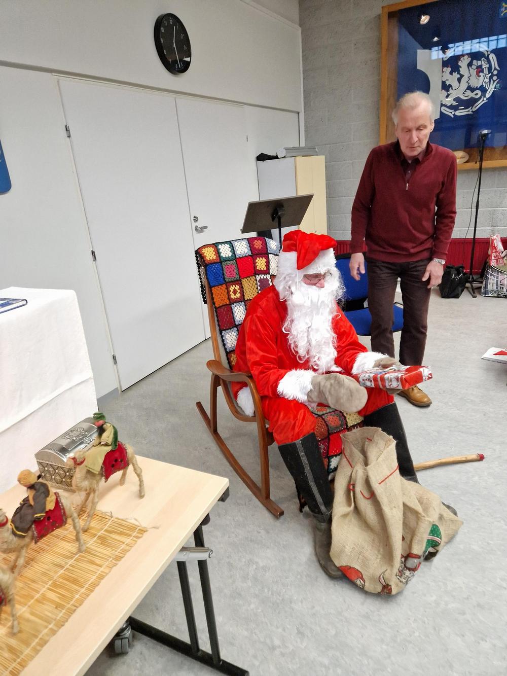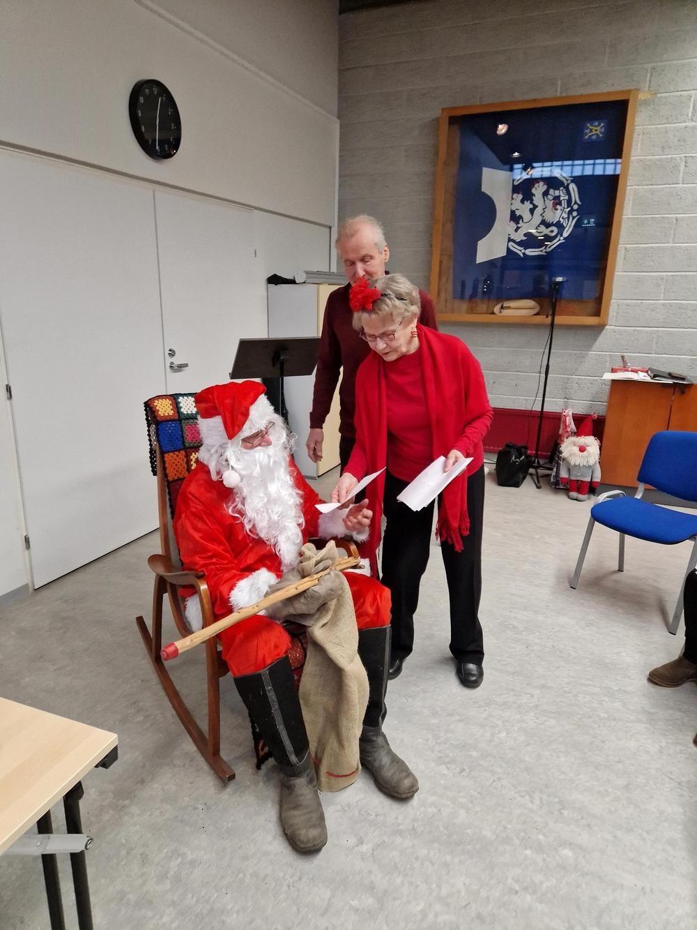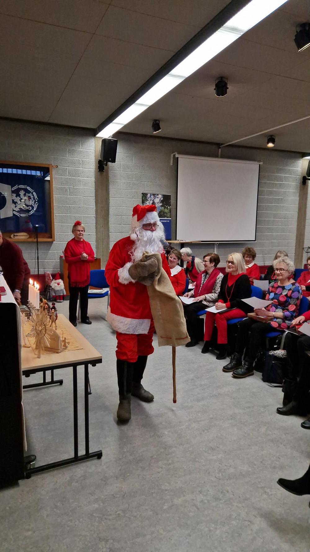 Puuron jälkeen kävi ilmi, että joillakin oli ilmeisesti pikkujoulujen jatkot venähtäneet, sillä La Cumparsitan joulumietteissä olivat sanat ja sävel menneet melkoisesti sekaisin! Kuoro päätti näyttää juhlijoille, miten Soihdut sammuu kuuluu laulaa. Laulu kuitenkin keskeytyi, kun ovi avautui ja itse Joulupukki astui sisään. Hän ei ollut koskaan aikaisemmin käynyt Yrjänässä ja oli jo kääntymässä ovelta takaisin, kun ei ollutkaan lapsia. Mutta kun kerroimme olevamme lapsenmielisiä, hän jäi istuskelemaan leppoisasti keinutuoliin ja vastaili muutamiin hänelle esitettyihin kiperiinkin kysymyksiin Korvatunturin viisaan varmuudella. Muutamalle hänellä oli lahjakin ja muita hän lohdutti sanomalla, että ehkäpä oikeana jouluna hekin saavat jotain.