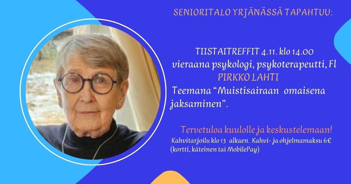 Psykologi, filosofian lisensiaatti Pirkko Lahti esitelmöi aiheesta "Muistisairaan omaisena jaksaminen"