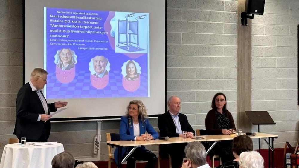 Senioritalo Yrjänän vaalikeskustelu 21.3.2023 oli menestys. Vaalipaneeliin osallistuivat kansanedustajan tehtävässä jo kokeneet kansanedustajaehdokkaat Ritva "Kike" Elomaa (PS), Anne-Mari Virolainen (KOK) ja Aki Lindén (SDP). Juontajana toimi emeritusprofessori Heikki Paloheimo. Väkeä oli paikalla yli 90. Keskustelun alussa Paloheimon esittämä vertailu Pohjoismaiden taloudellisesta ja väestöllisestä tilanteesta viritti hyvän ja rakentavan keskustelun siitä, miten taloudellisen kasvun kulta-aikoina rakennettua hyvinvointivaltiota on sopeutettava turvaamaan julkisten palveluiden saatavuus ja riittävyys tulevina vuosikymmeninä. Panelistien kesken vallitsi yhteisymmärrys siitä, että seuraavilla vaalikausilla tarvitaan erilaisia julkisen talouden sopeutustoimia.
