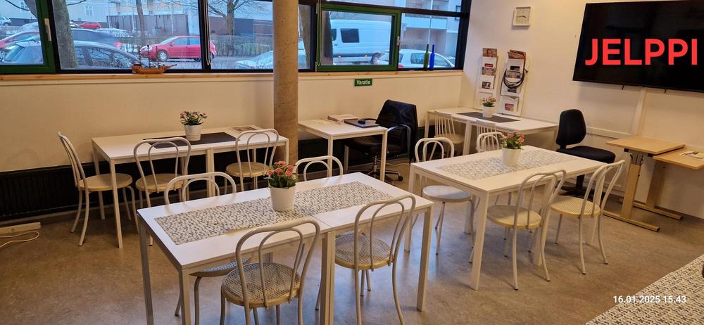 SeniorCafe Yrjänä, tilat max. 30 henkilölle. Tilassa on 75" näyttö